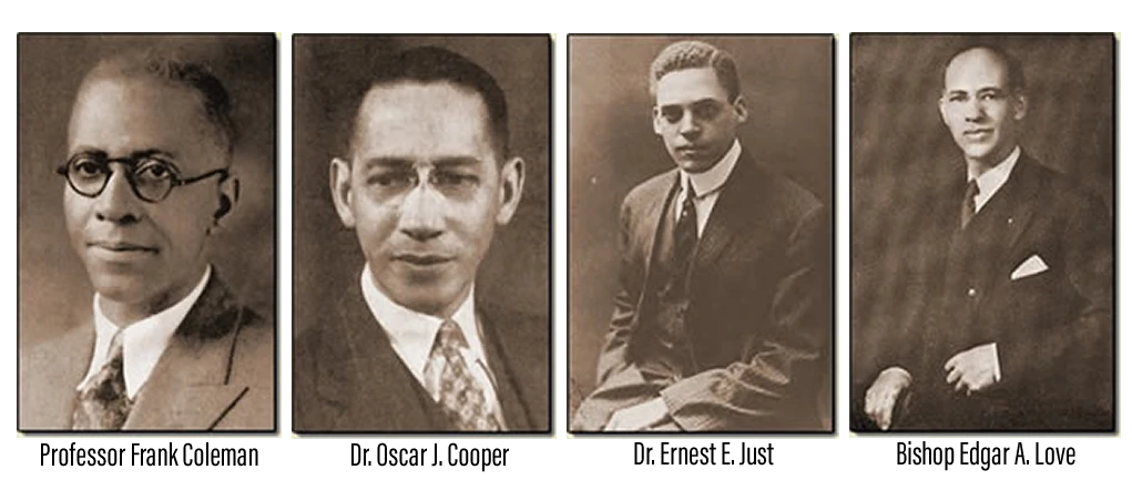 “Omega Dear,” was adopted as the official hymn in 1931. Charles R. Drew, professor of surgery, and Mercer Cook, professor of languages, both members of the Howard faculty, were the composers. Cook wrote the music and first stanza; Drew wrote the last two stanzas. By mid-1930, President Franklin D. Roosevelt created the Federal Council of Negro Affairs or “Black Cabinet,” which was an informal group of African-American public policy advisors who were organized to help the country emerge out of the depression. Omega men: Robert C. Weaver, Lawrence Oxley, Roscoe Brown, Frank Horne, William Hastie, J. Arthur Weiseger, Ted Poston, Campbell C. Johnson and William Trent were among those who served on the cabinet. Each of the founders graduated and went on to have distinguished careers in their chosen fields: Edgar Love became a bishop in the Methodist church; Oscar Cooper practiced medicine in Philadelphia for over 50 years; Frank Coleman became the chairman of the Department of Physics at Howard University and Ernest E. Just became a world-renowned biologist and the 1st recipient of the prestigious NAACP Spingarn Medal.